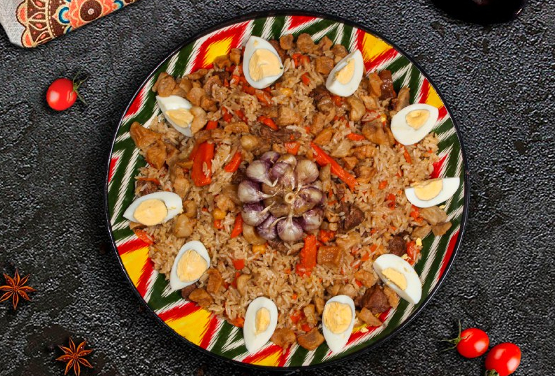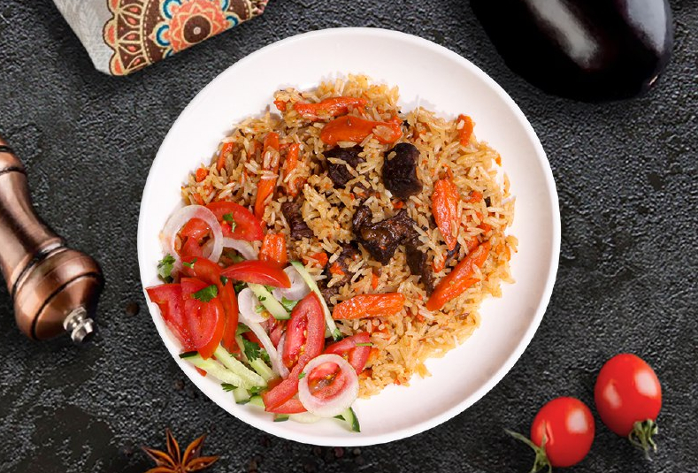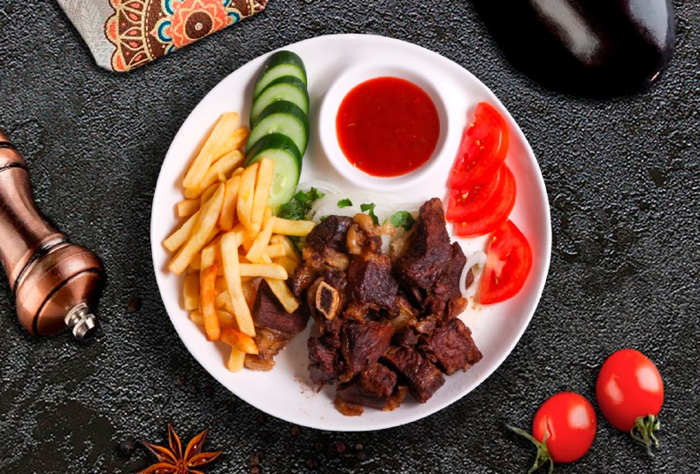 Жарено тушёная говядина, картофель фри, кетчуп. Овощная нарезка(Помидор, огурец, лук)