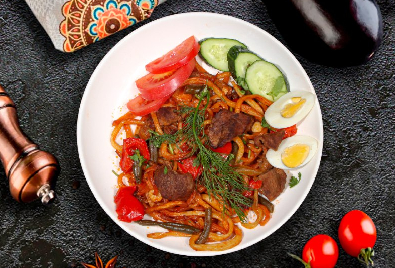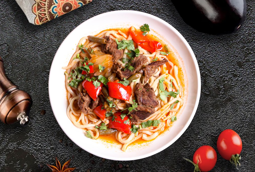 Лапша, мясо говядина, перец болгарский, пекинская капуста, стручковая фасоль, сельдерей, лук