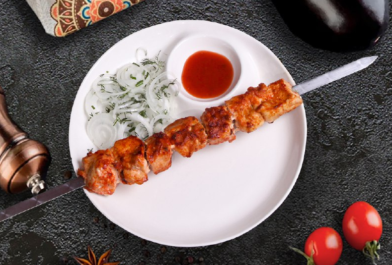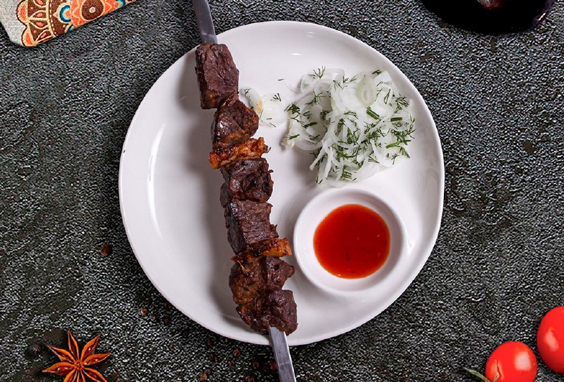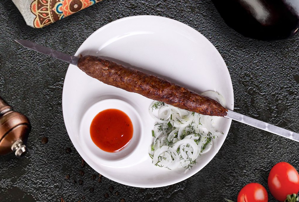 Говяжий фарш с луком, маринованный лук, шашлычный соус