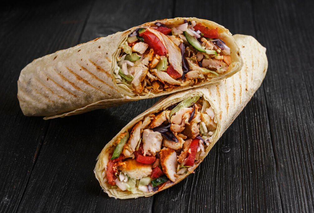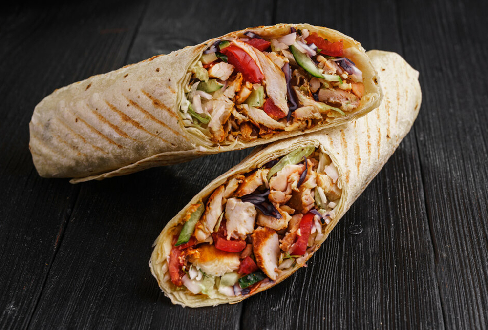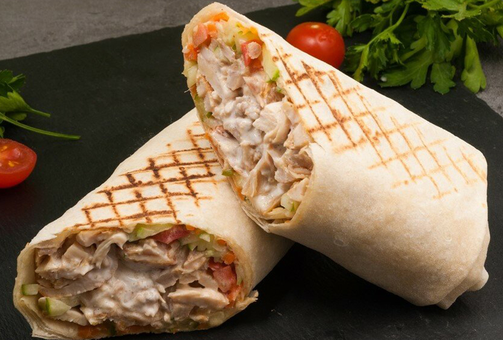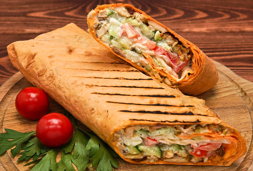 Лаваш, курица, маринованные шампиньоны, капуста, огурец, помидор, фирменный соус