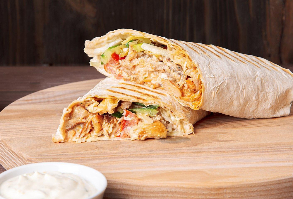 Лаваш, курица, сыр, маринованные шампиньоны, капуста, огурец, помидор, фирменный соус