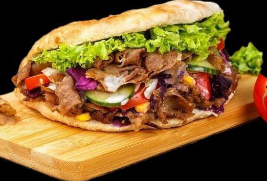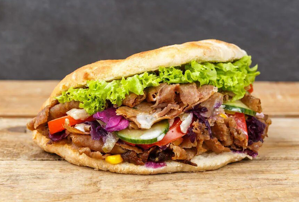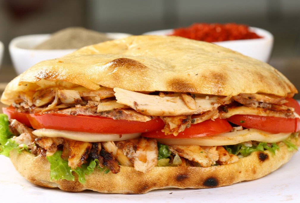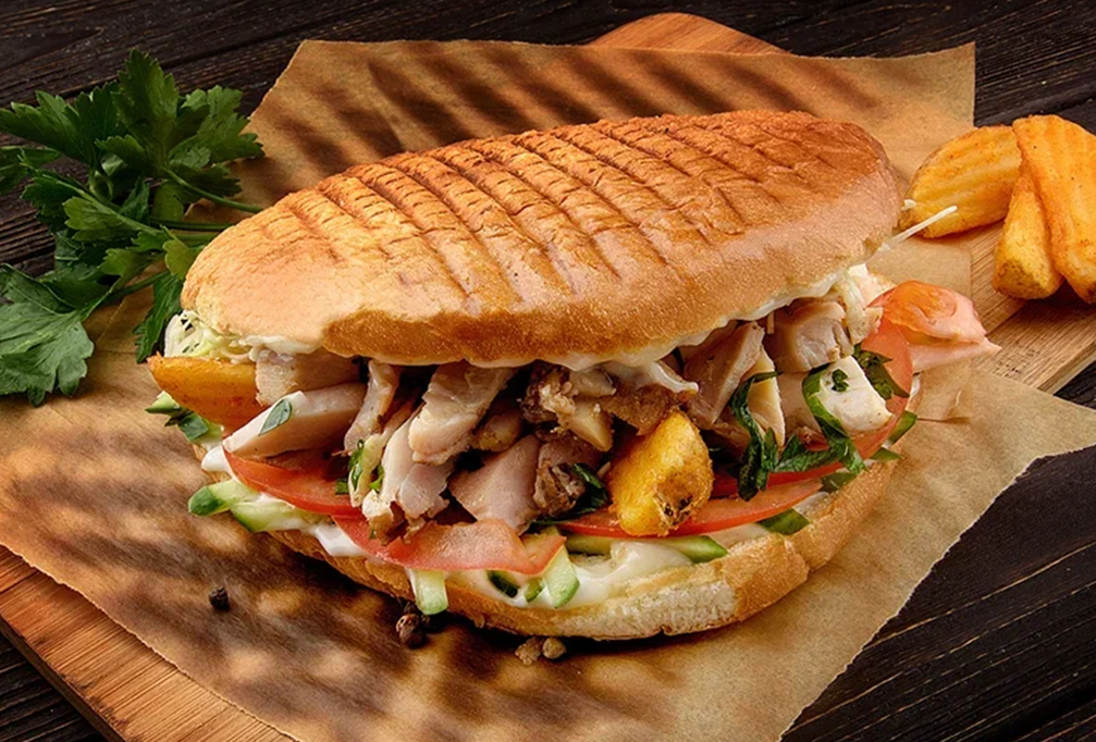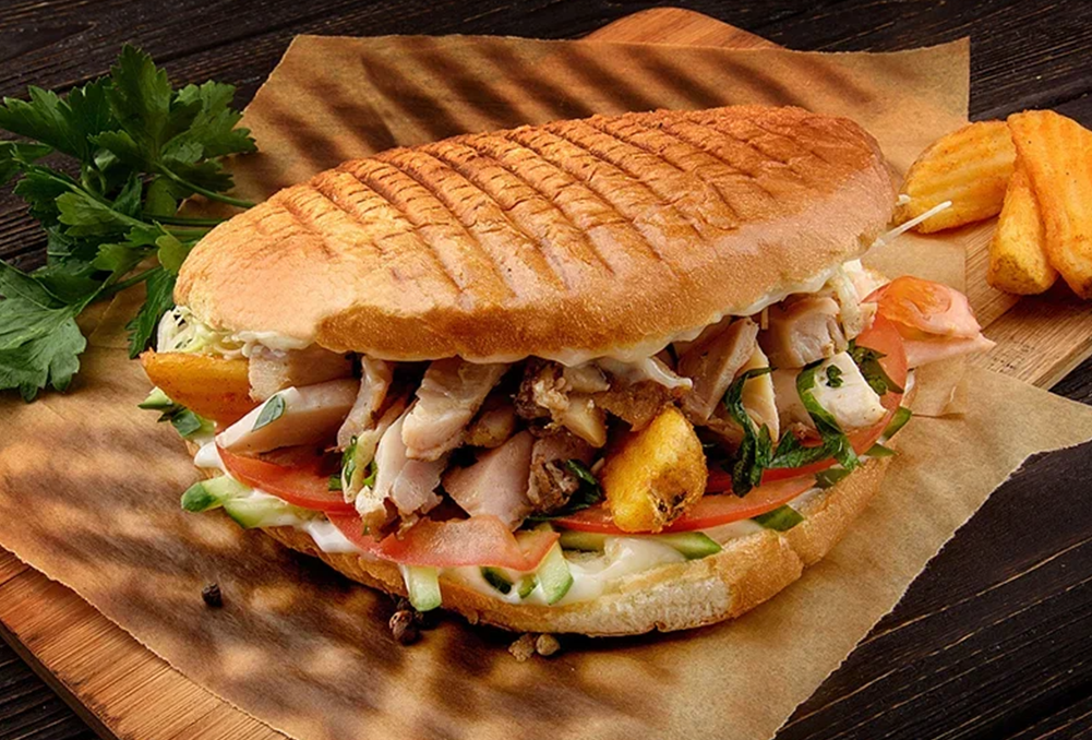 Тандырная булочка, курица, маринованные шампиньоны, капуста, огурец, помидор, фирменный соус, сыр